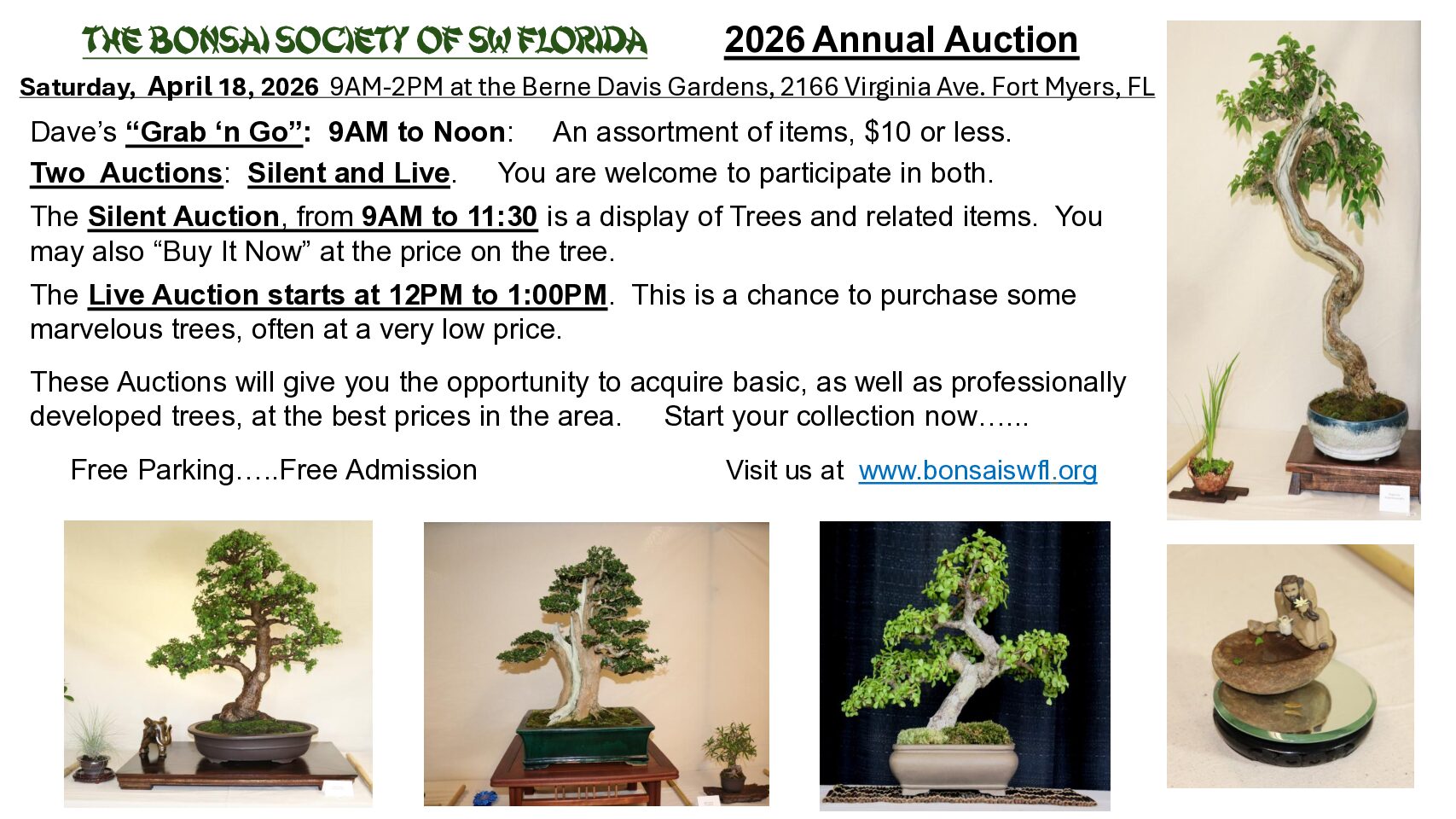 The Bonsai Society of Southwest Florida invites you to attend our Annual Bonsai Auction. This special event offers a wonderful opportunity to find exceptional deals at Dave’s Grab ‘n Go,...